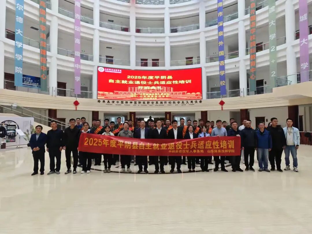 2025年9月26日,为期4天的平阴县2025年度秋季自主就业退役士兵适应性培训在山东深泉技师学院圆满落下帷幕。本次培训以“扶上马,送一程”为宗旨,以有集中开班仪式、有思政教育课、有“老班长”介绍经验、有就业宣传推介、有实地观摩交流的“五有”为标准,聚焦自主就业退役士兵就业创业需求,采取“线上+线下”的培训方式,助力其快速适应地方发展节奏,提升就业创业核心竞争力。